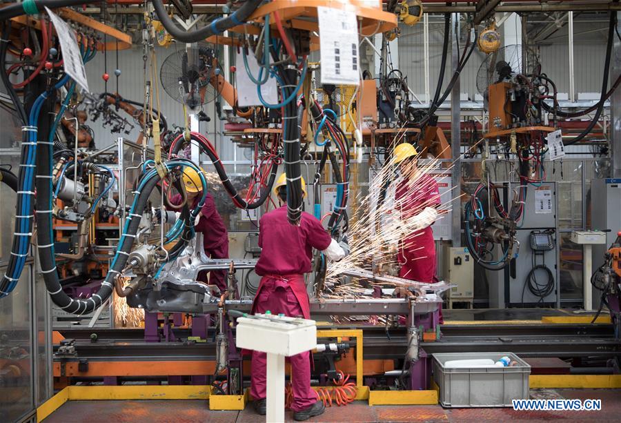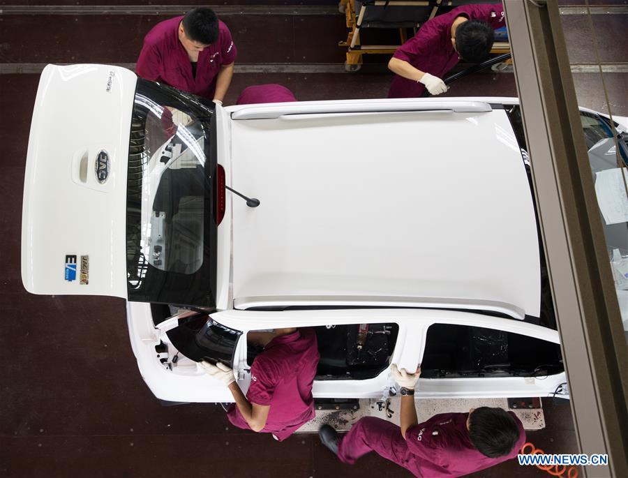 Des ouvriers travaillent sur un véhicule à énergies nouvelles dans l'usine de moteurs JAC à Tongling, dans la province chinoise de l'Anhui (est), le 7 ao?t 2018. Le gouvernement de Tongling prend des mesures visant à améliorer l'environnement et à développer l'industrie verte le long du fleuve Yangsté.