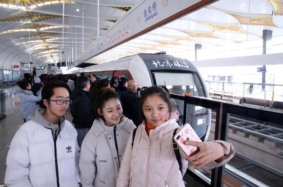 Des habitants de Beijing prennent un selfie devant un train maglev de la ligne S1 après leur arrivée dans la station. (Photo /vip.people.com.cn)
