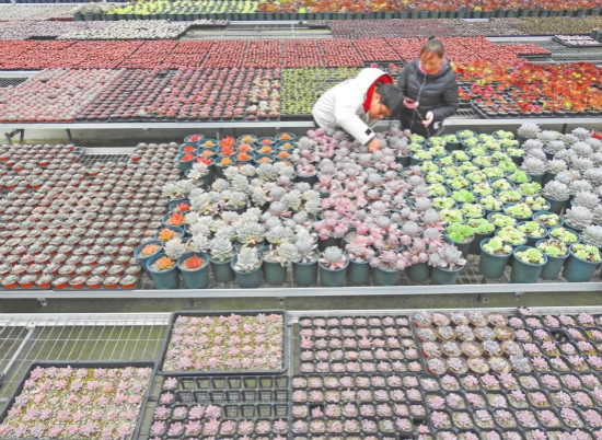 Le canton de Tuofeng du comté de Donghai, à Lianyungang, dans la province du Jiangsu, a vigoureusement développé l'industrie caractéristique de la culture de succulentes selon le modèle ? entreprise championne + Internet + agriculteurs ?. La photo montre des villageois de Tuofeng sélectionnent des succulentes pour leurs clients en ligne, le 25 février 2019. (Geng Yuhe / /vip.people.com.cn)