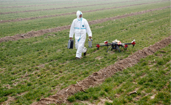 Un technicien utilise un drone pour effectuer des opérations de désherbage chimique dans le champ de blé du village de Lixin, dans le canton de Guandao du district de Linwei, à Weinan, dans la province du Shaanxi, le 5 mars 2019. (Photo Cui Zhengbo / /vip.people.com.cn)