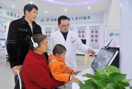 Un membre du personnel aide des patients à effectuer un traitement médical via la plateforme de consultation à distance par Internet dans le centre de services médicaux complets du comté de Dingnan, dans la province du Jiangxi, le 4 mars 2019. (Photo Chen Dichang / /vip.people.com.cn)