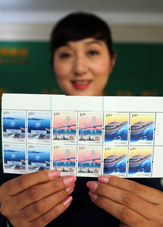 Le 30 octobre 2018, afin de commémorer l'ouverture du pont Hong Kong-Zhuhai-Macao, les postes de Chine, de Hong Kong et de Macao ont émis des timbres commémoratifs ? Pont Hong Kong-Zhuhai-Macao ?. La photo montre un membre du personnel du bureau de poste du comté de Boxing, à Binzhou, dans la province du Shandong (est de la Chine), présentant les timbres ? Pont de Hong Kong-Zhuhai-Macao ?. (Chen Bin /vip.people.com.cn)
