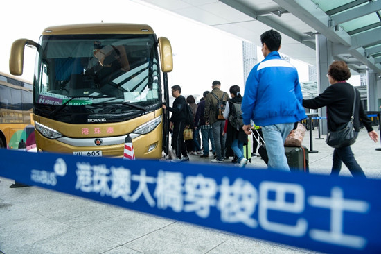 Des passagers prennent l'autobus en direction de Hong Kong au batiment d'inspection des frontières de Macao, situé sur le pont Hong Kong-Zhuhai-Macao, le 5 février 2019. (Photo / Xinhua)