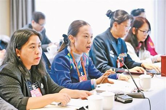 Des membres du Comité national de la Conférence consultative politique du peuple chinois assistent à une réunion de groupe pour discuter du projet de loi sur les investissements étrangers. (Zhou Can / Yunnan Daily)