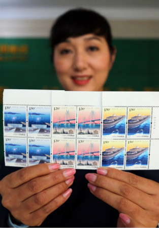 Le 30 octobre 2018, afin de commémorer l'ouverture du pont Hong Kong-Zhuhai-Macao, les postes chinoise de Hong Kong et Macao ont émis un timbre commémoratif ? Pont Hong Kong-Zhuhai-Macao ?. La photo montre une employée du bureau de poste du comté de Boxing, à Binzhou, dans la province du Shandong, montrant trois jeux de timbres ? Pont de Hong Kong-Zhuhai-Macao ?. (Chen Bin / vip.people.com.cn)