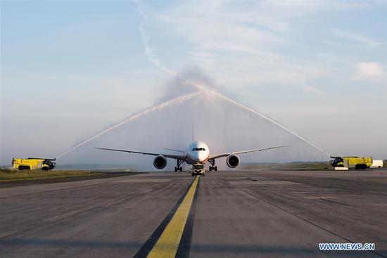 Un Boeing B787-9 Dreamliner de Shanghai Airlines, filiale de China Eastern Airlines, arrive à l'aéroport international Liszt Ferenc de Budapest, en Hongrie, le 7 juin 2019. (Photo / Xinhua)