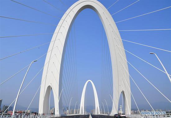 Photo prise le 29 septembre 2019 montrant le nouveau pont Shougang à Beijing, capitale de la Chine. Le pont a été ouvert à la circulation le 29 septembre. (Xinhua / Ren Chao)