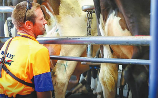 Un ouvrier de la société laitière néo-zélandaise Theland travaille dans le ranch. La société a vu son chiffre d'affaires grimper de 309% au cours du premier trimestre de cette année, après sa présence à la première CIIE. (Photo / China Daily)