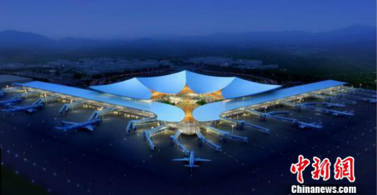 Une photographie d'interprétation de l'aéroport Gonggar rénové à Lhassa, capitale de la région autonome du Tibet (sud-ouest de la Chine). Le projet de rénovation a franchi une étape importante le 11 octobre avec l'achèvement des travaux concrets du terminal 3, le plus grand de la région autonome.