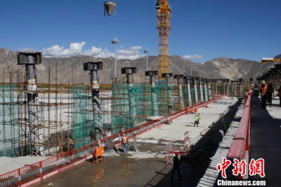 La rénovation en cours à l'aéroport Gonggar de Lhassa, capitale de la Région autonome du Tibet (sud-ouest de la Chine). Le projet de rénovation a franchi une étape importante le 11 octobre avec l'achèvement des travaux concrets du terminal 3, le plus grand de la région autonome.