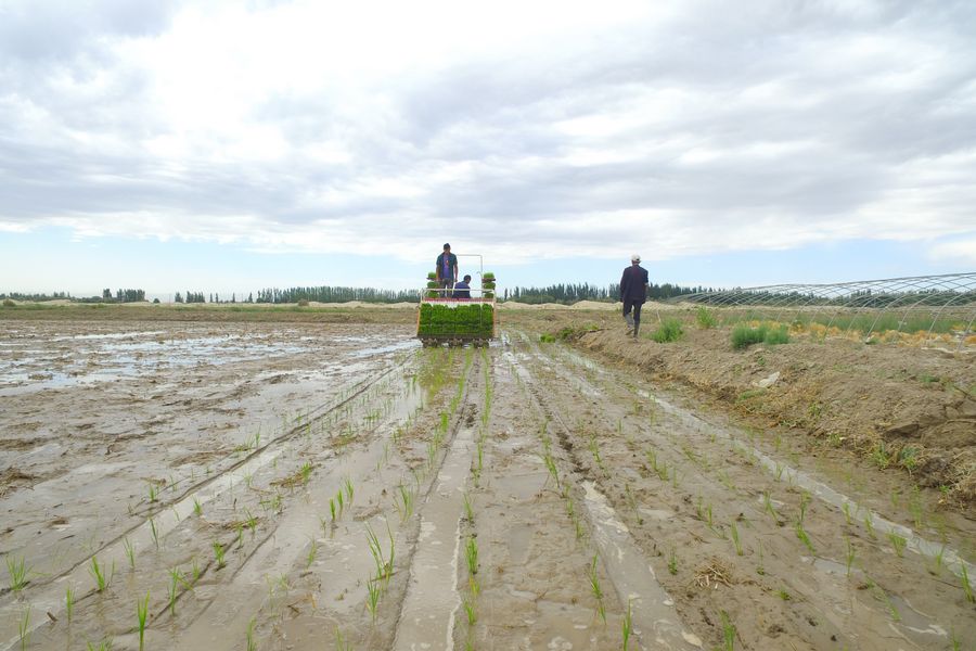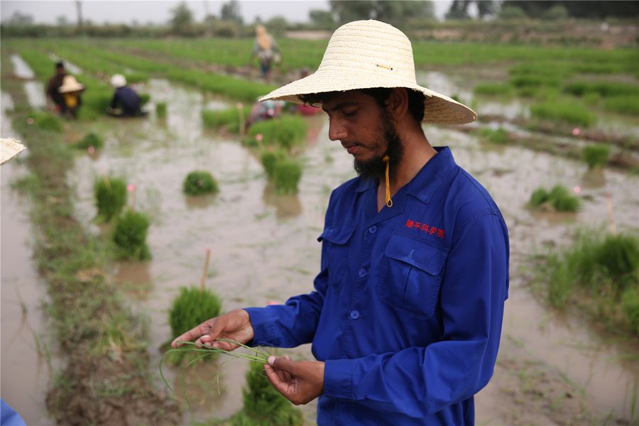 L'équipe de recherche et de développement sur le riz de sol salé de Yuan Longping travaille dans un champ d'essai à Baiyiawati, dans le comté de Yopurga de la région autonome ou?ghoure du Xinjiang (nord-ouest de la Chine), le 3 juin 2019. L'équipe de recherche et de développement sur le riz de sol salin de Yuan Longping, pionnier prestigieux du riz hybride, étend son échelle de plantation sur la bordure ouest du désert du Taklamakan dans la région autonome ou?ghoure du Xinjiang (Xinhua / Ren Liying).