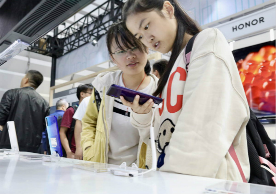 Des visiteurs essaient des smartphones Honor le 22 octobre lors de l'exposition Lumière de l'Internet à Wuzhen, dans la province du Zhejiang (est de la Chine). (Photo Zhu Xingxin / China Daily)