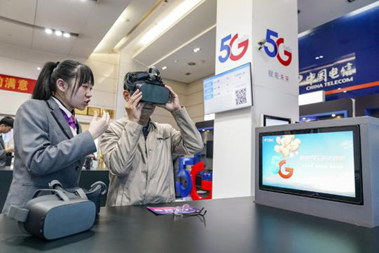 Un visiteur découvre un casque de réalité virtuelle prenant en charge la technologie 5G dans un point de vente China Telecom à Beijing. (Photo / Xinhua)