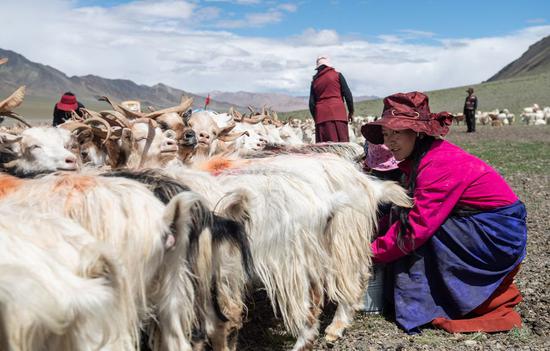 Une bergère d'une coopérative trait des brebis dans le comté de Rutog de la préfecture de Ngari, dans la région autonome du Tibet (sud-ouest de la Chine), le 4 ao?t 2019. (Jigme Dorje / Xinhua)