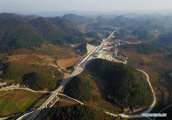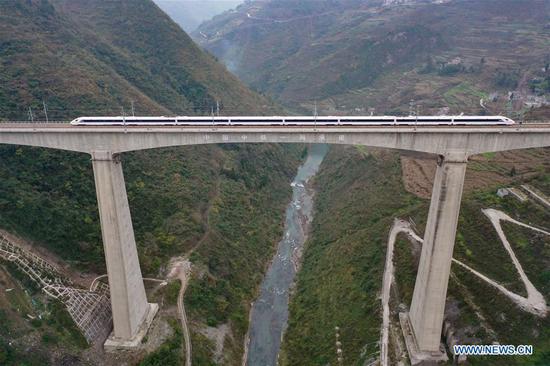 Photo aérienne montrant le chemin de fer Chengdu-Guiyang à Qingzhen, dans la province du Guizhou (sud-ouest de la Chine), le 15 décembre 2019. (Photo / Xinhua)