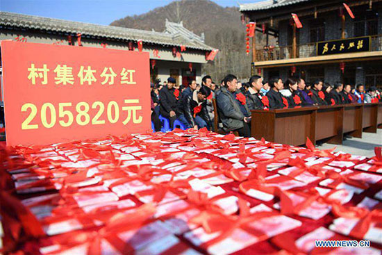 Des villageois assistent à une cérémonie de distribution de dividendes annuels dans le village de Daoping à Longnan, dans la province du Gansu (nord-ouest de la Chine), le 7 janvier 2020. Les villageois de 79 ménages qui sont actionnaires de la coopérative du village de Daoping ont re?u leurs dividendes pour l'année 2019 mardi. Au total, 785 000 yuans (112 600 dollars) ont été distribués individuellement et collectivement au village cette année. Daoping était autrefois un village frappé par une pauvreté profonde. Depuis 2018, le village s'est efforcé de sortir de la pauvreté en créant des coopératives et en développant des industries telles que le tourisme dans les anciens villages, l'élevage et le commerce électronique rural. (Xinhua / Chen Bin)
