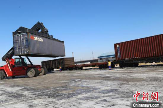 Un conteneur est levé sur le train de marchandises Daqing-Zeebrugge à la gare de Wolitun, province du Heilongjiang. (Photo fournie à China News Service)?