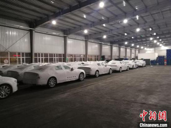 Des véhicules sont chargés dans un conteneur qui doit être transporté dans le train de marchandises Daqing-Zeebrugge à la gare de Wolitun, dans la province du Heilongjiang (nord-ouest de la Chine). (Photo fournie au China News Service)