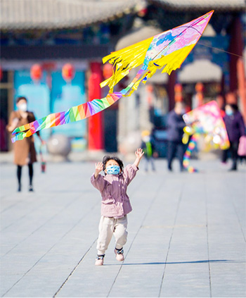 Le 16 mars 2020, à Hohhot de Mongolie-Intérieure, des citoyens, bien protégés, sont sortis de chez eux pour profiter du printemps. Dans la photo, un enfant court derrière un cerf-volant. Ding Genhou/Photo du Quotidien du Peuple