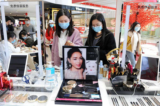 Des acheteurs achètent des cosmétiques dans un magasin à Nanjing, capitale de la province du Jiangsu (est de la Chine), le 15 mars 2020. (Yu Ping / China Daily)