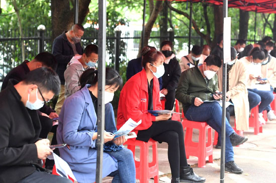 Des demandeurs d'emploi attendent le 21 avril dans une foire du district de Hannan à Wuhan, capitale de la province du Hubei (centre de la Chine). C'était le premier salon de l'emploi hors ligne de la ville depuis le début de l'épidémie de nouveau coronavirus. (Li Ziyun / China Daily)