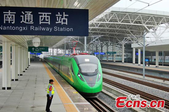 Un train à grande vitesse vert Fuxing effectue un parcours d'essai sur la ligne Nantong-Shanghai, le 26 mai 2020. (Photo / China News Service)
