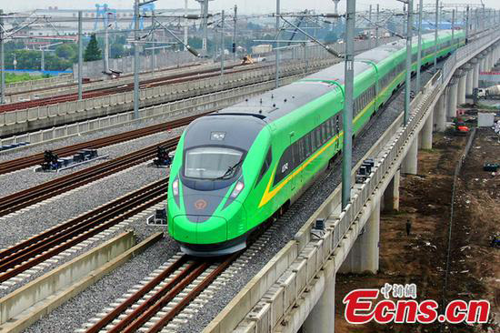 Un train à grande vitesse vert Fuxing avec une vitesse con?ue de 200 km/h a effectué un parcours d'essai le 26 mai sur la ligne Nantong-Shanghai.