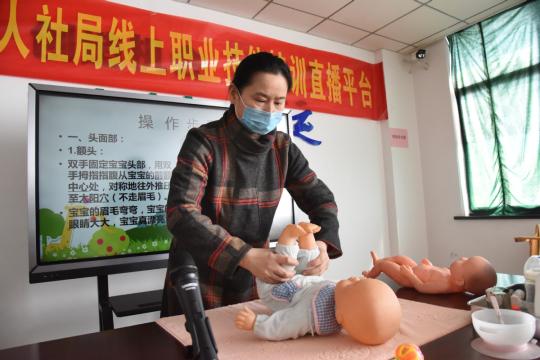 Une femme donne des cours en ligne sur les soins aux nourrissons grace à la diffusion en direct à Qingdao, dans la province du Shandong (est de la Chine), en mars, afin d'aider les ch?meurs à acquérir des compétences professionnelles. (Photo / Xinhua)