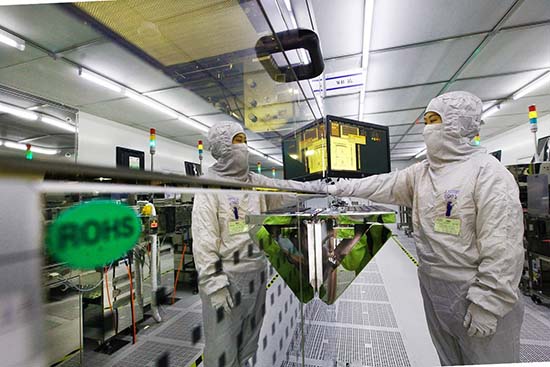 Le 29 mai, dans l'atelier de précision sans poussière de la société Guangzhen Optics Technologies. Co., Ltd. dans la zone de développement économique du comté de Feidong de la ville de Hefei de la province de l'Anhui, des agents techniques testent les produits électroniques commandés sur la ligne de production. Wang Wensheng/Photo du Quotidien du Peuple