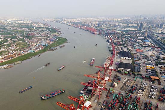 Le 7 juin, la photo montre la vue aérienne de l'arrondissement de Baoshan à Shanghai. Les bateaux naviguent sur le fleuve Huangpu. Le chargement et le déchargement au quai Zhanghuabang se poursuivent. Wang Yuning/Photo du Quotidien du Peuple