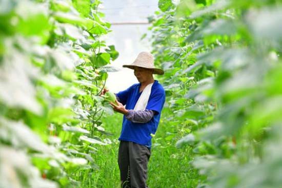Un villageois contr?le la croissance de melons sucrés dans une serre du village de Gulantun, dans le canton de Daliang du comté de Rongan, dans la région autonome Zhuang du Guangxi (sud de la Chine), le 18 ao?t 2019. (Photo / Xinhua)