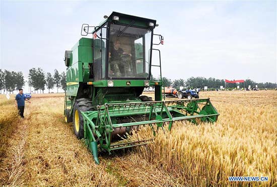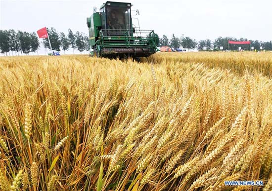 Récolte du blé dans le bourg de Tianzhuang à Pingdu, à Qingdao, dans la province chinoise du Shandong (est), le 12 juin 2020. (Xinhua/Li Ziheng)