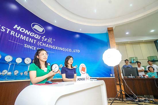 Des membres du personnel du ministère du Commerce extérieur présentent les produits de la société Zhejiang Hongqi Instrument Co., Ltd. dans la salle de diffusion en direct de l'entreprise sur la plate-forme de diffusion en direct de la Foire de Canton, le 15 mai. (Wu Zheng / Pic.people)