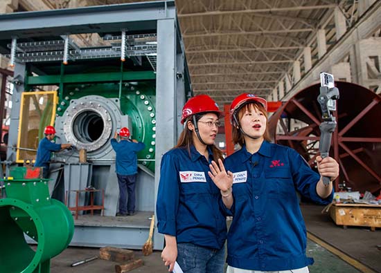 Des membres du personnel du groupe Pengfei, de la ville de Haian, dans la province du Jiangsu (est de la Chine), présente la situation de production de l'entreprise à des clients nationaux et étrangers via la plate-forme de diffusion en direct de la Foire de Canton, le 15 juin. (Zhai Huiyong / Pic.people)