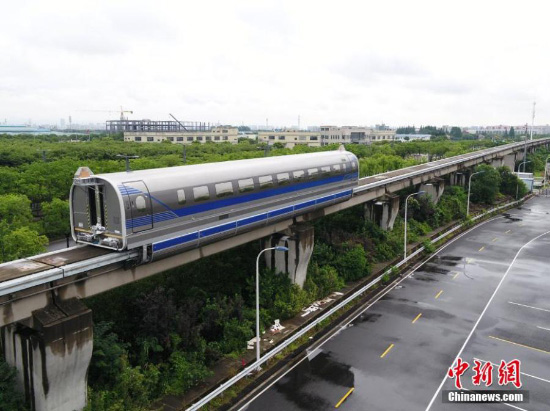 Photo aérienne prise le 21 juin 2020 montrant un prototype de train à sustentation magnétique développé en Chine, avec une vitesse maximale de 600 km/h, lors d'un test de vitesse à Shanghai. Lors du premier essai qui a eu lieu le 21 juin sur une ligne de test de maglev, plus de 200 composants, notamment les conditions de fonctionnement des aiguillages, des petites courbes et des rampes, ont été analysés.(Photo/China News Service)