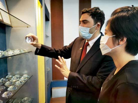Fabien Azzi, un entrepreneur fran?ais présente les produits fabriqués par son entreprise à un client de Dalian, dans la province du Liaoning (nord-est de la Chine), en juin 2020. (Zhang Xiaomin / China Daily)