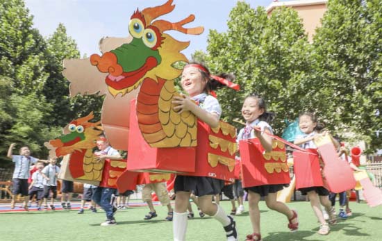 Le 24 juin, dans la maternelle Colorful Sunshine de la ville de Tengzhou, dans la province du Shandong (est de la Chine), les enfants ont utilisé les accessoires faits de bo?tes en carton pour faire l'expérience du ? Bateau-Dragon ?. (Song Haicun / Pic.people)