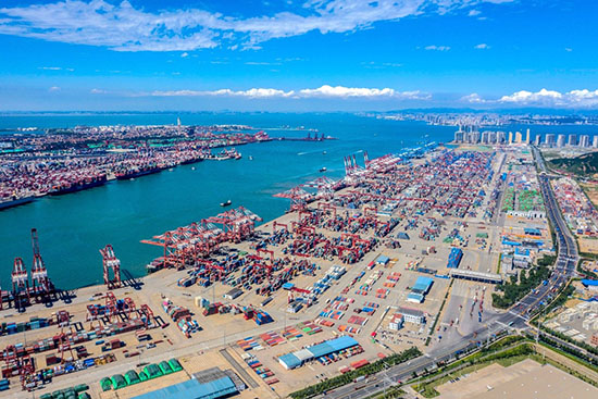 La zone portuaire du port de Qianwan, située dans le nouveau district de Xihai'an de Qingdao, dans la province du Shandong (est de la Chine), en pleine activité, le 27 juillet. (Han Jiajun / Pic.People)