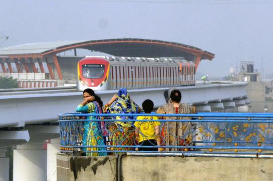 Photo prise le 16 mai 2018 montrant des gens qui regardent le train de métro de la ligne orange lors d'un essai à Lahore (est du Pakistan). (Sajjad / Xinhua)
