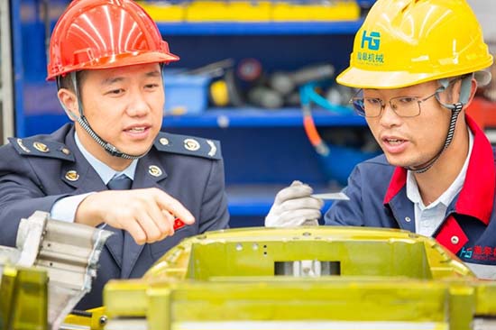 Dans l'atelier de production de Hangao Machinery Equipment Co., Ltd. à Rugao, dans la province du Jiangsu (est de la Chine), le personnel du Bureau des imp?ts s'enquiert sur place du volume des commandes et de l'état de la production des produits d'exportation, le 10 octobre. (Xu Hui / Pic.people.com.cn)