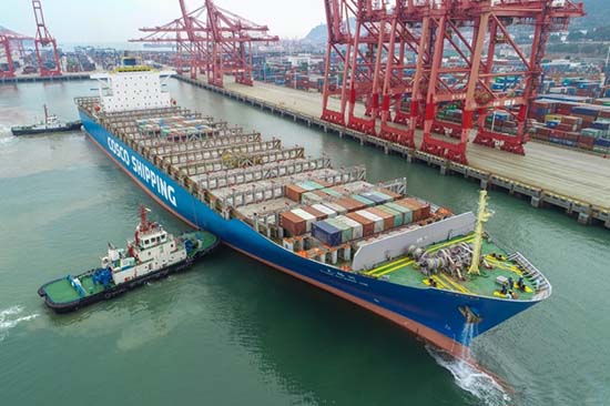 Un grand porte-conteneurs accoste au terminal à conteneurs du port de Lianyungang, dans la province du Jiangsu (est de la Chine), le 13 octobre. (Wang Jianmin / Pic.people.com.cn)