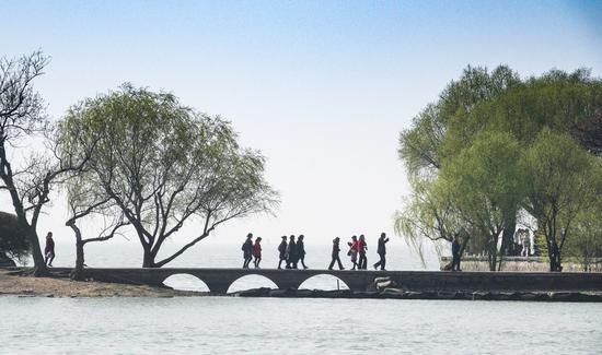 Des touristes visitent le site touristique de Yuantouzhu sur le lac Taihu à Wuxi, dans la province du Jiangsu (est de la Chine), le 13 mars 2021. (Yang Lei / Xinhua)