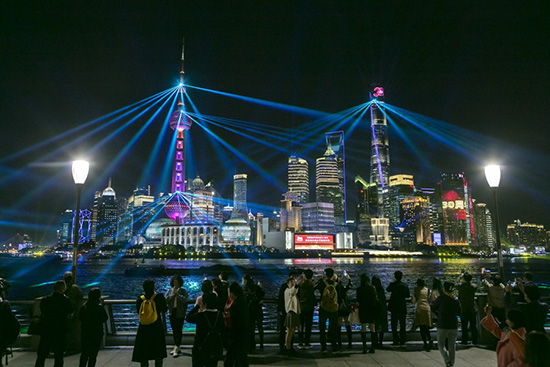 Des touristes assistent à un spectacle de lumières dans le quartier de Lujiazui dans le district de Pudong à Shanghai (est de la Chine), le 12 novembre 2020. (Wang Xiang / Xinhua)