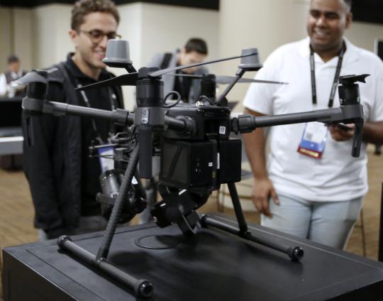 Les visiteurs montrent leur intérêt pour un drone lors d'une exposition high-tech organisée à Los Angeles par le fabricant de drones DJI basé à Shenzhen en septembre 2020. (Photo/Xinhua)