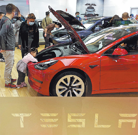 Des clients visitent un magasin Tesla dans un centre commercial de Beijing(capitale, nord de la Chine), le 13 mars. (Photo / China Daily)