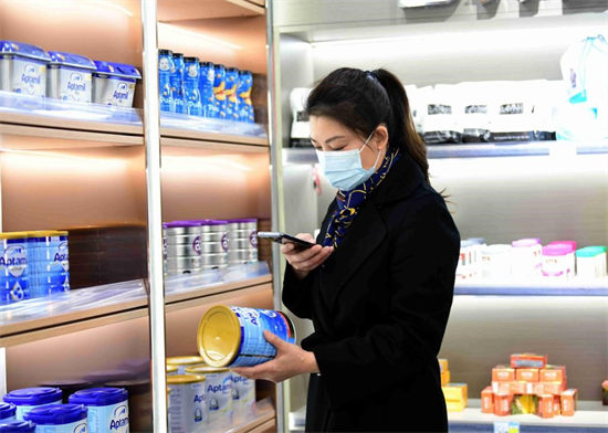 Le 20 février 2021, le premier magasin de produits de zone franche livrés par les trains de fret Chine-Europe s'est ouvert dans la province du Jiangxi (dans le sud-est de la Chine). Des consommateurs achètent des produits importés. (Hu Guolin/Pic.people.com.cn)