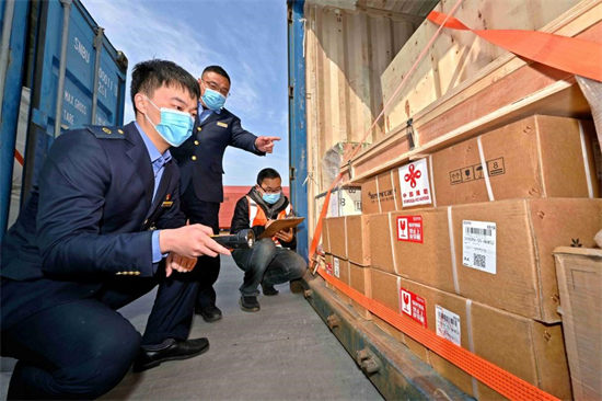 Le 23 février 2021, des personnels de la section de Xinxiang de la ville de Zhengzhou (dans le centre de la Chine) de la ligne ferroviaire effectuent une vérification de conteneurs de fournitures anti-épidémiques. Ces matériels médicaux seront livrés au district d'Alamüdün du Kirghizstan dans le cadre de l'aide fournie par la Chine. (Wang Wei/Pic.people.com.cn)