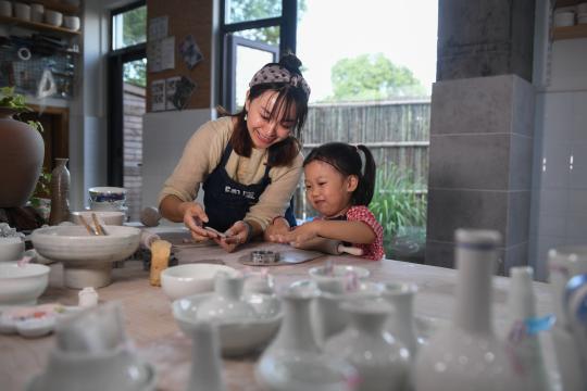 Wang Tao, un potier, enseigne à un jeune visiteur la fa?on de faire de la poterie à Kunshan, dans la province du Jiangsu (est de la Chine), le 27 septembre 2020. (Photo/Xinhua)