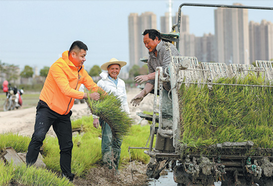Hong Liangbin (à gauche) aide à faire les semis dans une base de riziculture à Jinjiang, dans la province du Fujian (sud-est de la Chine), en avril. (Photo / China Daily)