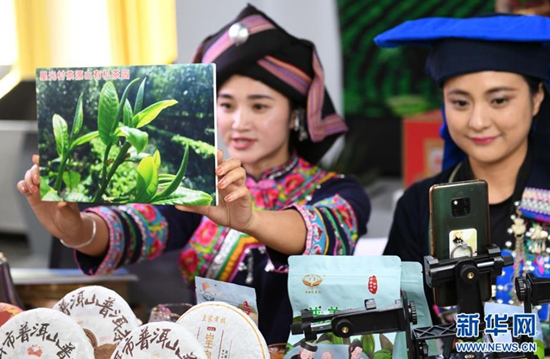 Deux femmes vendent du thé local lors d'une diffusion en direct sur Internet dans le district autonome Yi et Hani, dans la province du Yunnan (sud-ouest de la Chine), le 6 avril 2020. (Photo/Xinhua)